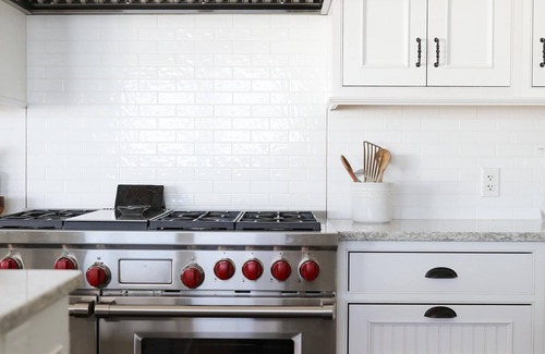 appliances, including 6-burner with griddle, double oven, quartz countertops, a large