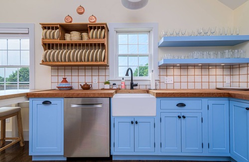 Originally built in 1895 and completely renovated in 2021, this home boasts 5 bedrooms and 5 full baths. This beautiful home sits on 2.5 acres across the street from Mackerel cove on picturesque Ft. Getty Road. This home offers the perfect setting to relax on the expansive balcony or explore the island of Jamestown. This home features a gourmet kitchen with beautiful water views of Narragansett Bay and serene landscape of Fort Getty. The dining area connects both the North and South area's of the home large enough to seat 15. There is a great room with cathedral ceilings, pool table, full bath, full bar and access to the patio to grill, lounge or dine. There is a secondary living area on the Northernly end of the home featuring a fireplace cozy seating area with leather couches. Also available on this level you will find the elevator, fully equipped laundry room, mudroom, guest suite with king bed and large bath. There is a primary bedroom on the second level down the hall from the kitchen with King bed, oversized bathroom and a room with queen bed. Also on the second level and southernly end of home are two additional bedrooms on with a queen bed and the other with two twin beds. A back staircase allows privacy between the 'North' and 'South' area's of the home. However, located on first level there is an elevator for accessibility to the reverse living layout and. Weekly rates vary based on high and low season. Dates/rates available upon request.